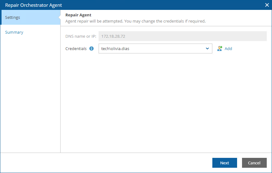- At the Settings step, select the necessary account from the Credentials drop-down list for connecting to the Veeam Backup & Replication server. For an account to be displayed in the Credentials list, it must be added to the configuration database as described in section Adding Credentials. If you have not set up an account beforehand, click Add and follow the steps of the Add Credential wizard. For more information on the required account permissions, see Permissions.