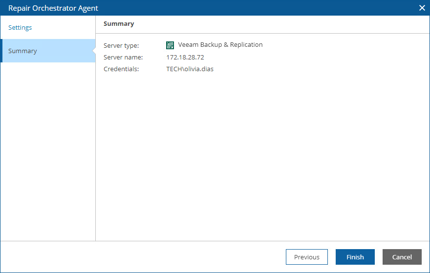 If you want to change credentials of a user account that you specified when connecting a Veeam Backup & Replication server to Orchestrator, or if you encounter a connection issue and a Veeam Backup & Replication server acquires the Disconnected state, you can repair the Orchestrator agent running on the server.