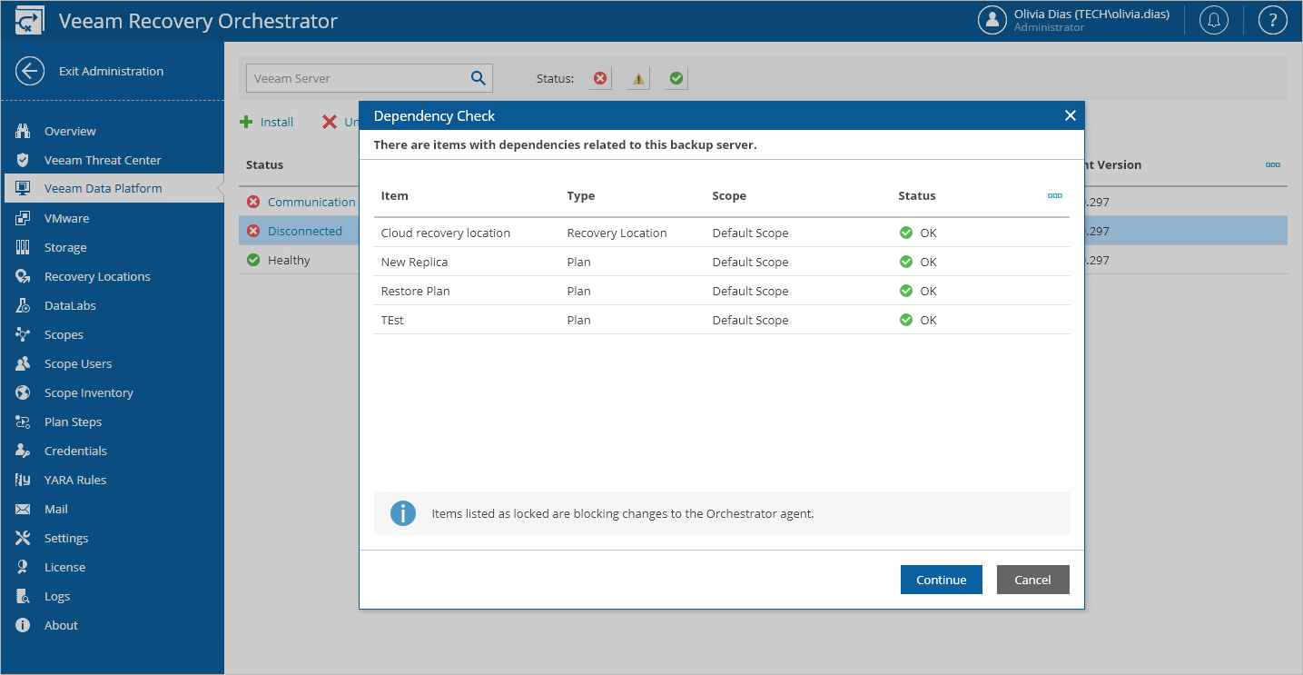 - The Dependency Check window will inform you if any DataLabs or recovery plans are related to the Veeam Backup & Replication server.