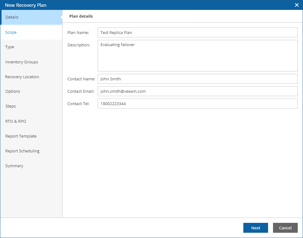 At the Details step of the wizard, use the Plan Name and Description fields to enter a name for the new plan and to provide a description for future reference. The maximum length of the plan name is 64 characters; the following characters are not supported: * : / \ ? " < > | .