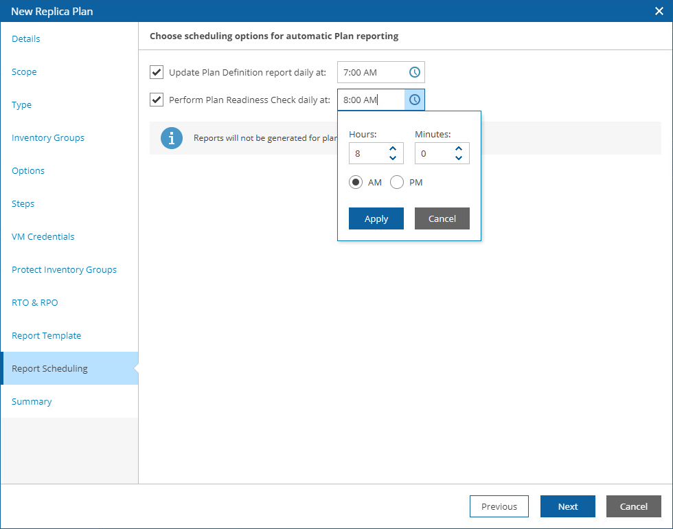 To specify the exact time at which the report will be generated, click the Schedule icon next to the Update Plan Definition report daily at or Perform Plan Readiness Check daily at check box, set the desired time, and click Apply.