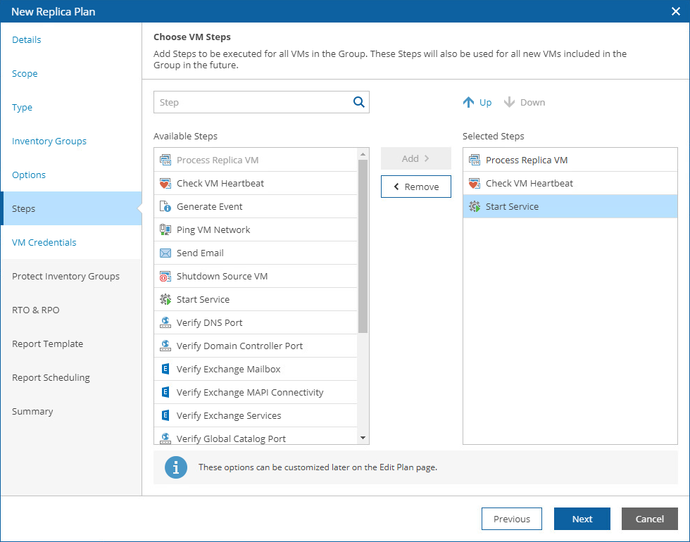 At the Steps step of the wizard, use the list of plan steps to select steps to be performed for each VM during failover. Keep in mind that Process Replica VM step must execute first for the failover process to perform successfully.
