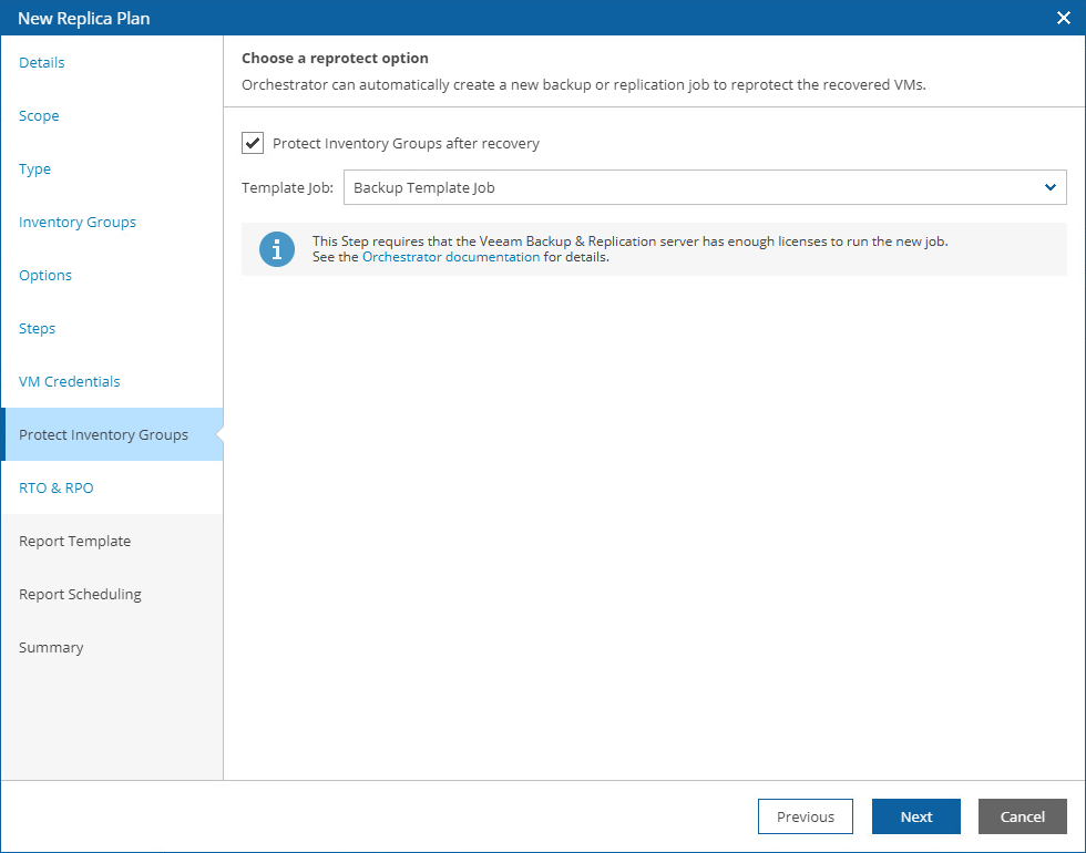 At the Protect Inventory Groups step of the wizard, use the Protect Inventory Groups after recovery check box to choose whether you want to protect VMs in the plan post-recovery with a backup or replication job.