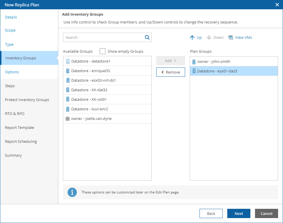 At the Inventory Groups step of the wizard, select inventory groups that you want to recover, and click Add to include them in the plan.