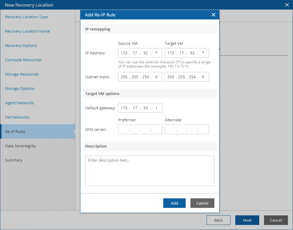 To configure a re-IP rule, click Add at the Re-IP Rules step of the wizard. Then, do the following in the Add Re-IP Rule window: