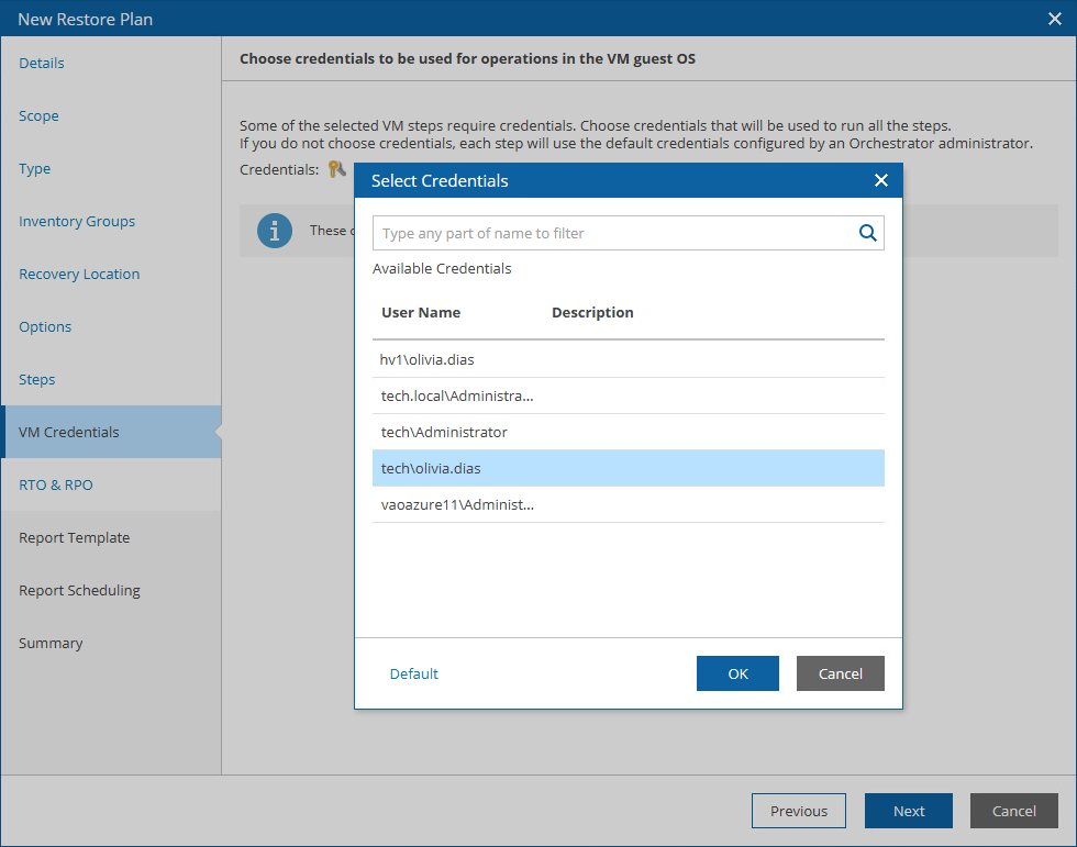 At the VM Credentials step of the wizard, specify credentials that will be used to access guest OSes of machines. To do that, click the link in the Credentials section and select the necessary credentials in the Select Credentials window. For a credential record to be displayed in the Available Credentials list, it must be added to the list of inventory items for the scope, as described in section Managing Inventory Items.