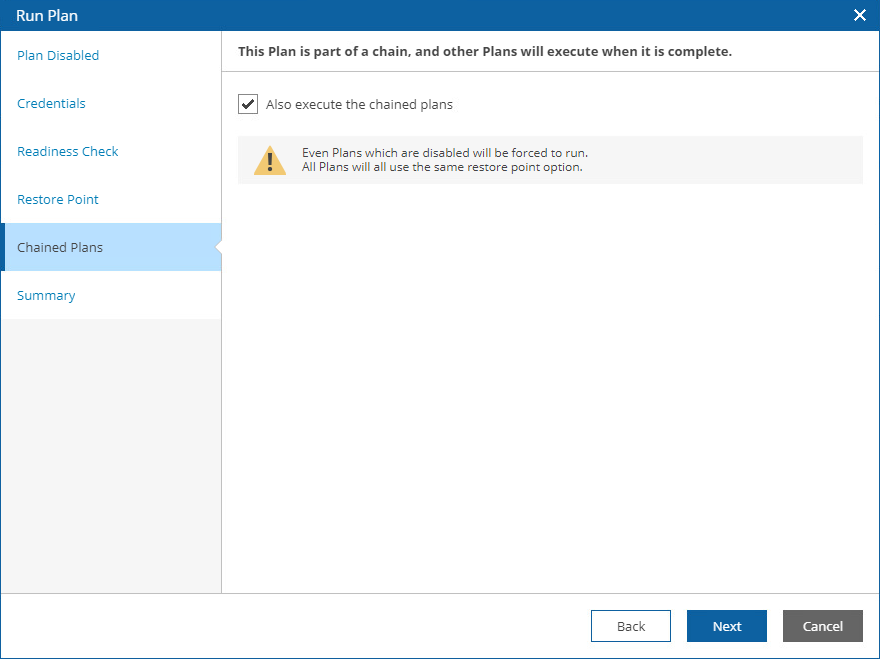 At the Chained Plans step, select the Also execute the chained plans check box to proceed to the execution of subsequent plans after the current plan enters the FAILOVER state.