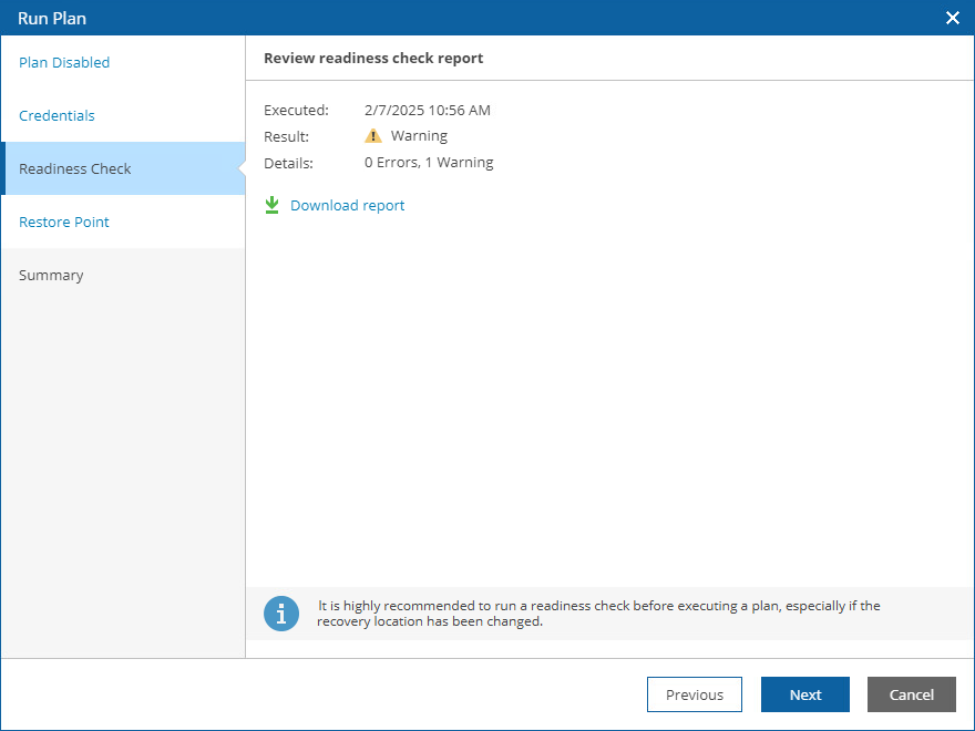 - At the Readiness Check step, review the results of the most recent readiness check run for the plan to make sure the plan will be able to complete successfully.