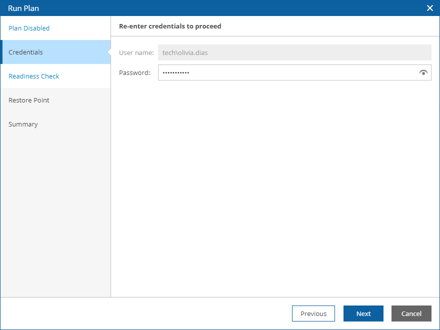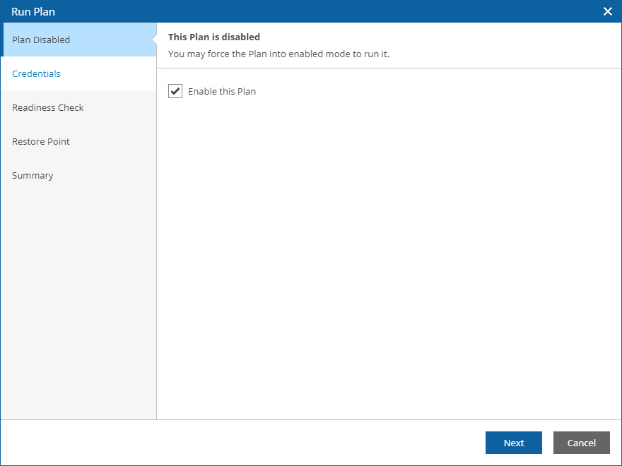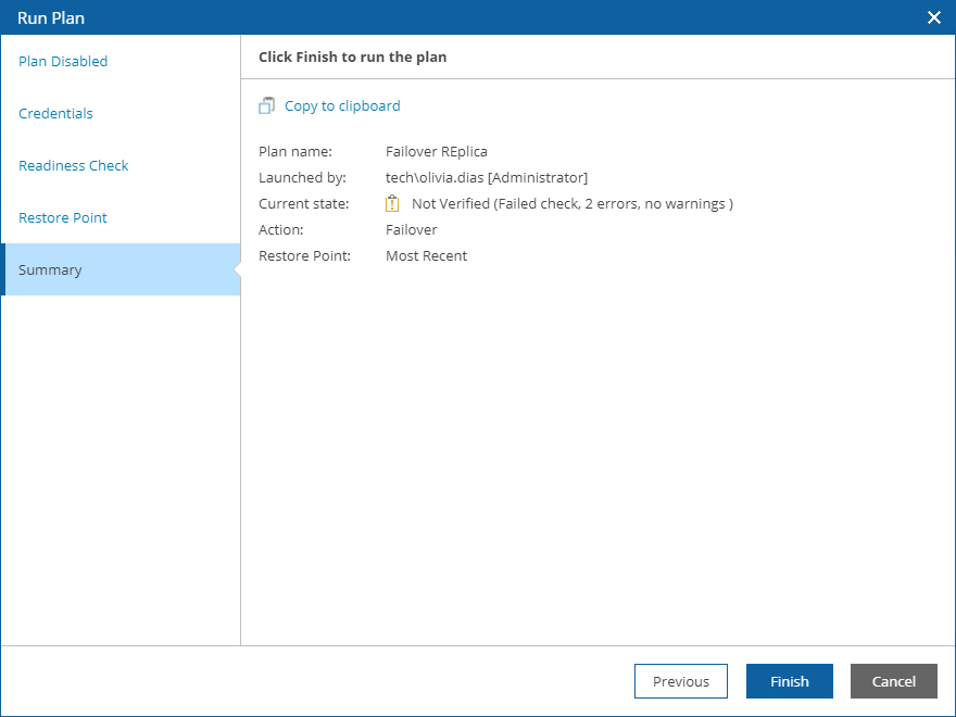 The Run action causes VMs in a plan to fail over to their replicas. For more information on the replica failover process, see the Veeam Backup & Replication User Guide, section Replica Failover.