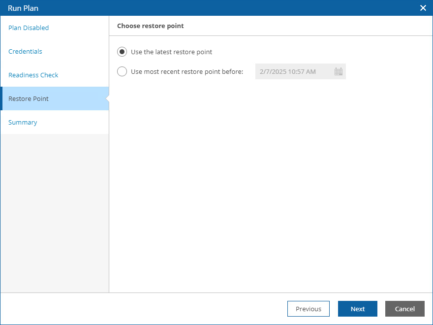 - At the Restore Point step, choose a restore point that will be used to recover VM replicas.