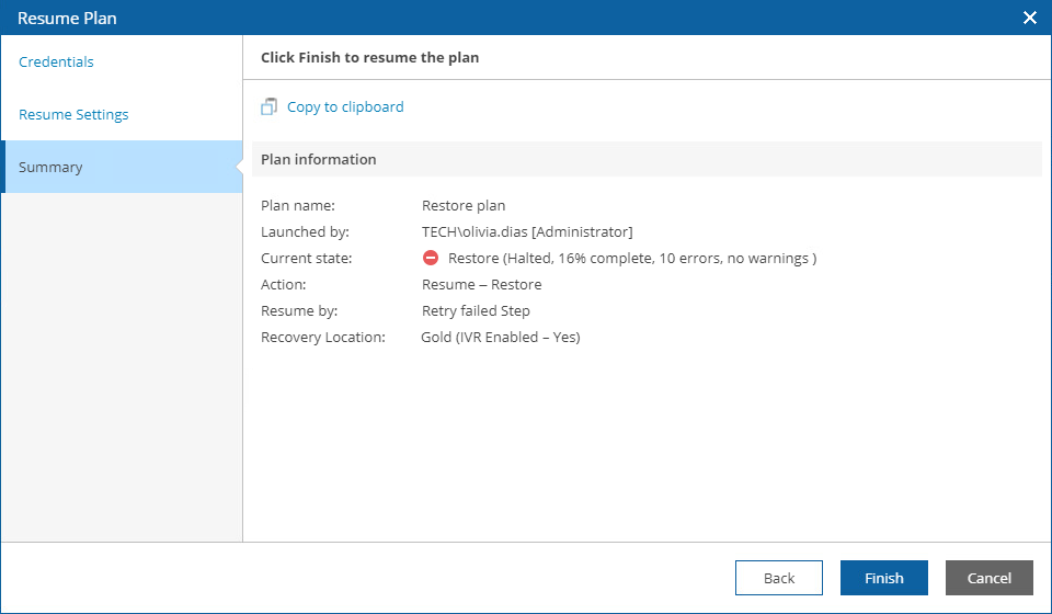 - At the Summary step, review configuration information and click Finish. The restore process will be started.