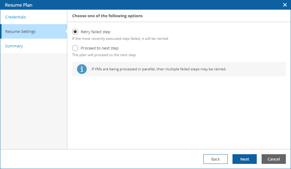 Choose whether you want to proceed with plan execution from the next plan step or to retry the failed step.
