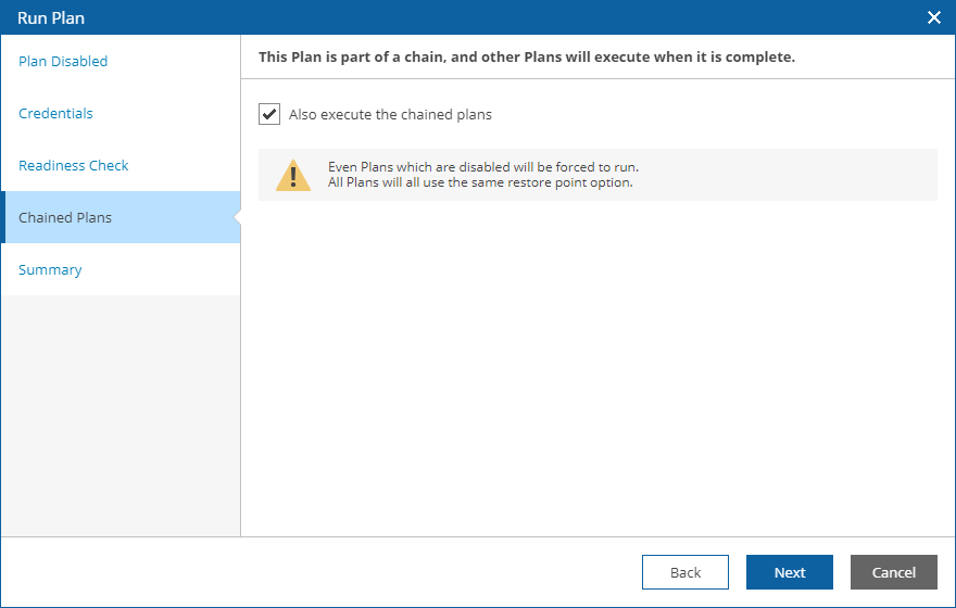 At the Chained Plans step, select the Also execute the chained plans check box to proceed to the execution of subsequent plans after the current plan enters the FAILOVER state.