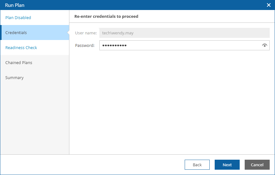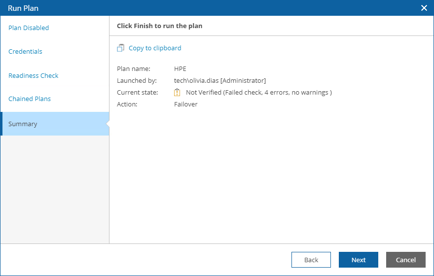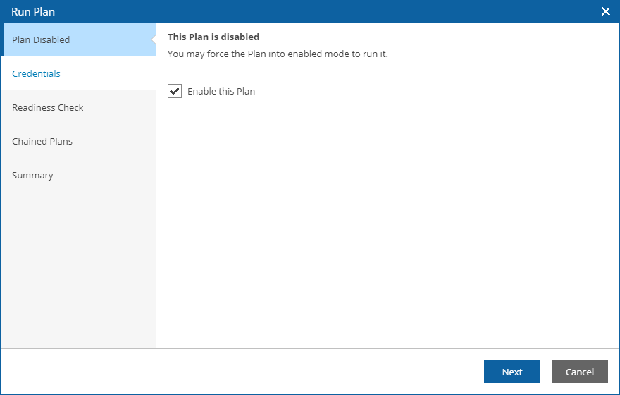 - At the Readiness Check step, review the results of the most recent readiness check run for the plan to make sure the plan will be able to complete successfully.