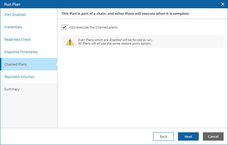 At the Chained Plans step, select the Also execute the chained plans check box to proceed to the execution of subsequent plans after the current plan enters the FAILOVER state.