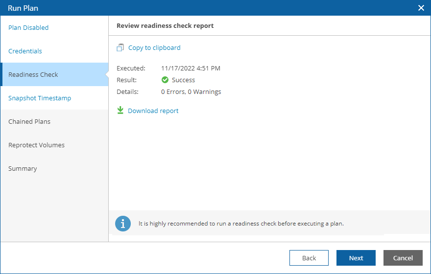 - At the Readiness Check step, review the results of the most recent readiness check run for the plan to make sure the plan will be able to complete successfully.