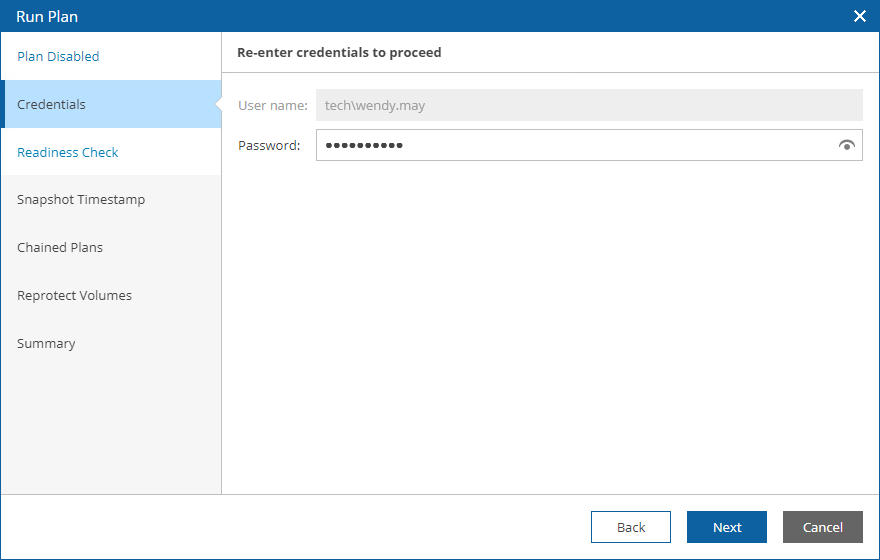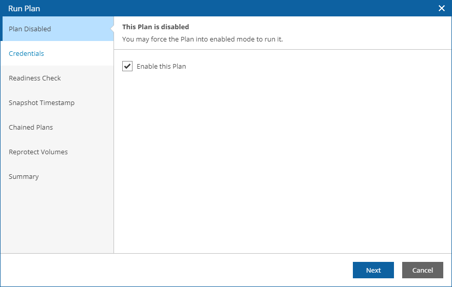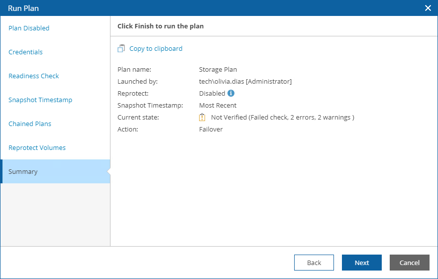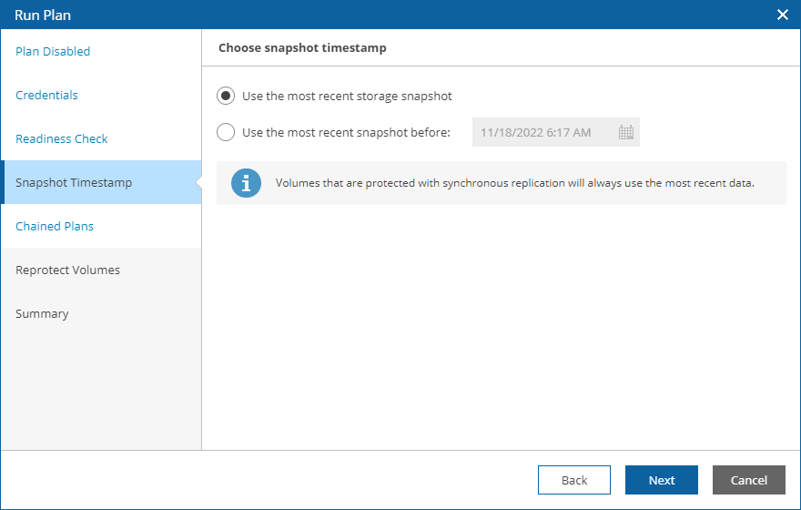 The Protect Storage Volumes step will interfere with the existing jobs that use storage snapshots in Veeam Backup & Replication. Since the step reverses the source and destination roles of SnapMirror relationships, these jobs will no longer function properly after the storage failover process completes. To work around the issue, add the Veeam Job Actions step to the list of pre-plan steps before running the plan. To disable a job, specify its name when configuring the step parameters. |