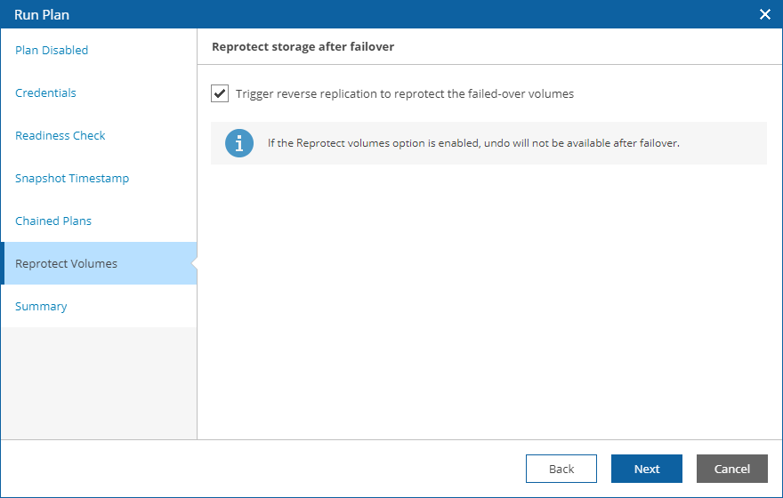 - At the Reprotect Volumes step, choose whether you want Orchestrator to trigger reverse replication to reprotect volumes included in the plan. This option can be useful if you plan to fail back to the production location.
