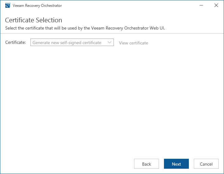 At the Certificate Selection step of the wizard, choose an SSL certificate that will be used to secure traffic between the Orchestrator UI and a web browser.