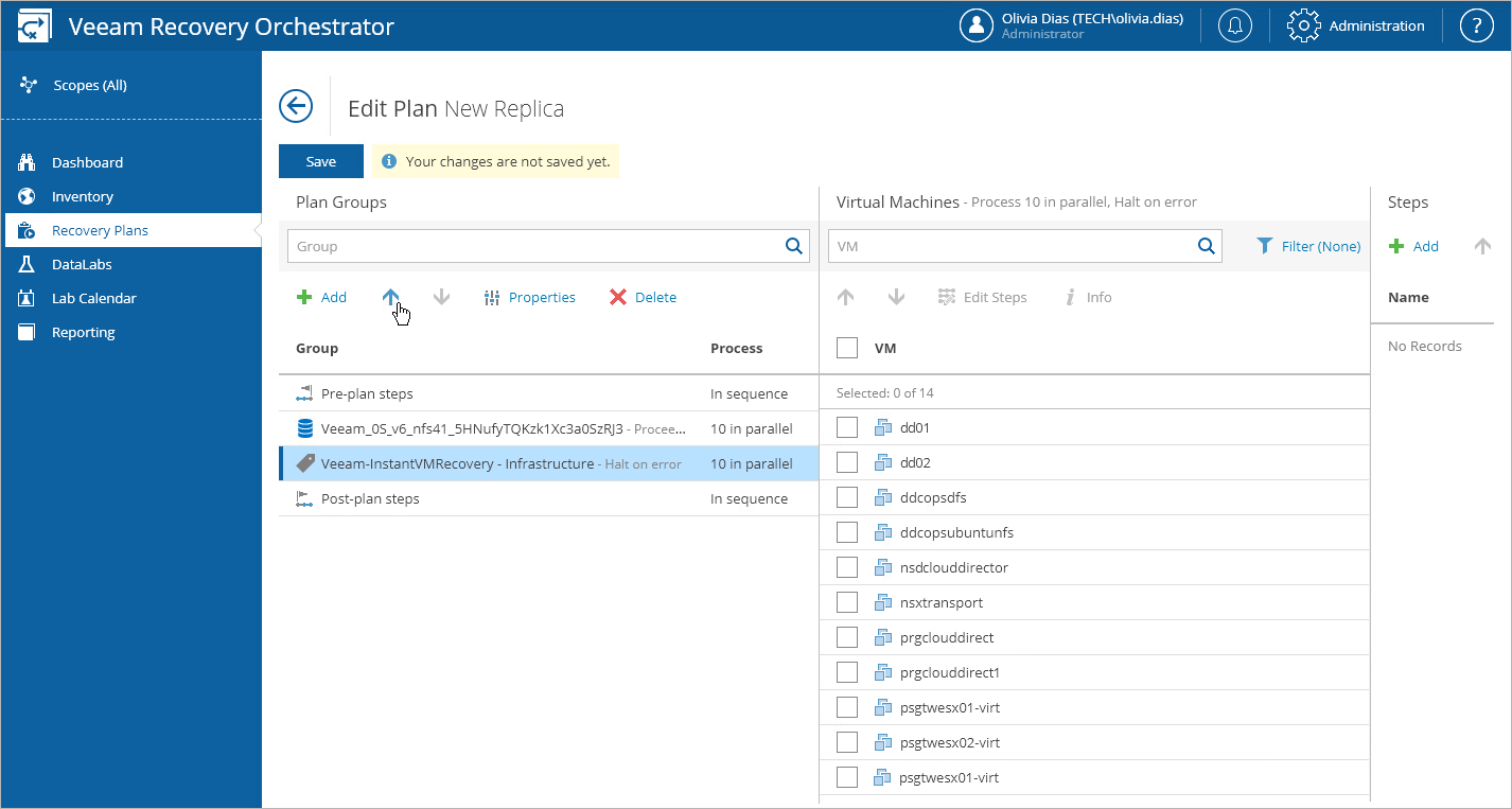 By design, each recovery plan contains 2 default groups — Pre-plan steps and Post-plan steps. These groups include plan steps that run before and after the recovery process. You cannot change the processing order for the Pre-plan steps and Post-plan steps groups, but you can add and remove steps for these groups. For more information, see Configuring Steps. |