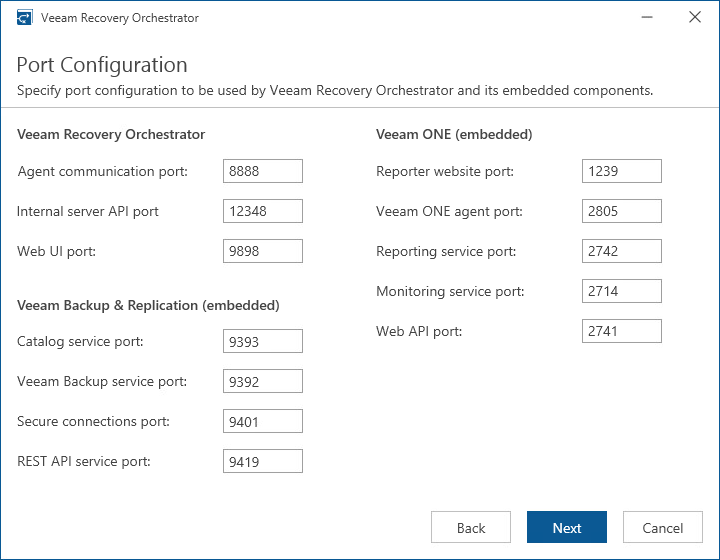 - Veeam Backup & Replication (embedded) communication ports that will be used for communication between Orchestrator and Veeam Backup & Replication components, and for connecting to the REST API functionality.