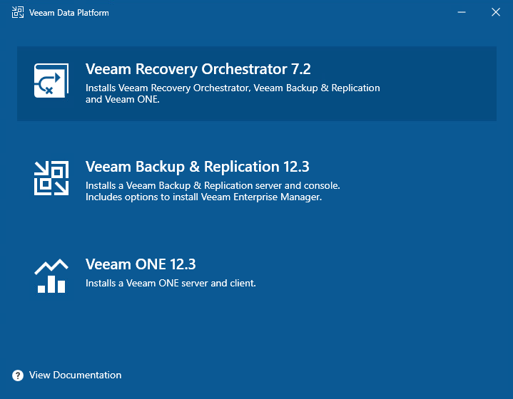 This is an archive version of the document. To get the most up-to-date information, see the current version. Step 2. Start Setup Wizard To launch the Veeam Recovery Orchestrator Setup wizard, click Veeam Recovery Orchestrator 7.2.TipTo install Veeam Backup & Replication, follow the instructions provided in the Veeam Backup & Replication User Guide, section Deployment.To install Veeam ONE, follow the instructions provided in the Veeam ONE Deployment Guide, section Installing Veeam ONE.