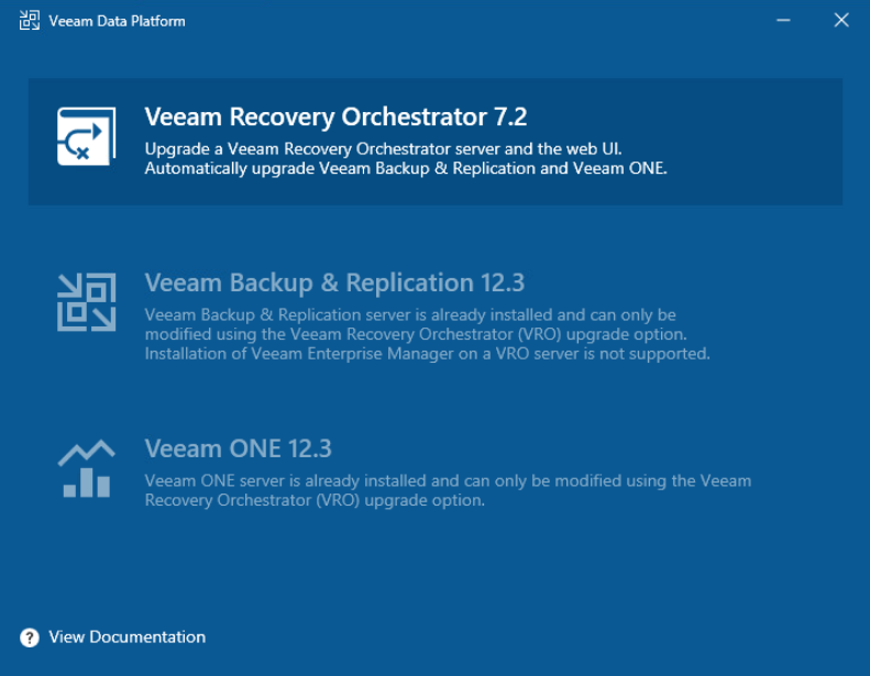 This is an archive version of the document. To get the most up-to-date information, see the current version. Step 2. Start Setup Wizard To launch the Veeam Recovery Orchestrator Setup wizard, click Veeam Recovery Orchestrator 7.2.