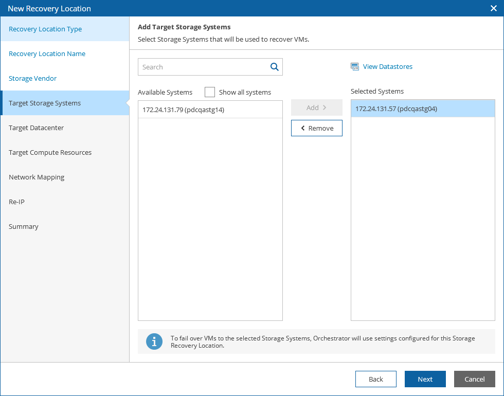At the Target Storage Systems step of the wizard, specify target storage systems to be used to recover VMs. To do that, select the required storage systems in the list of available systems and click Add.