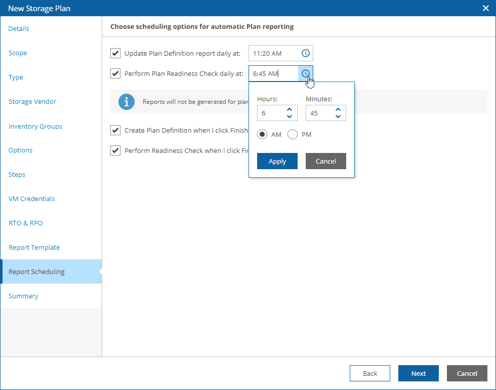 To specify the exact time at which the report will be generated, click the Schedule icon next to the Update Plan Definition report daily at or Perform Plan Readiness Check daily at check box, set the desired time, and click Apply.