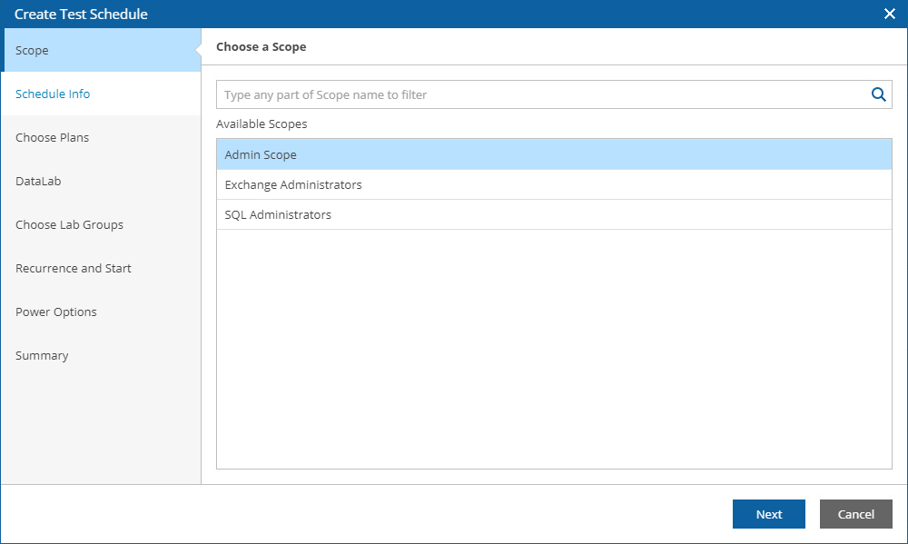 At the Scope step of the wizard, select a scope for which you want to create the schedule.