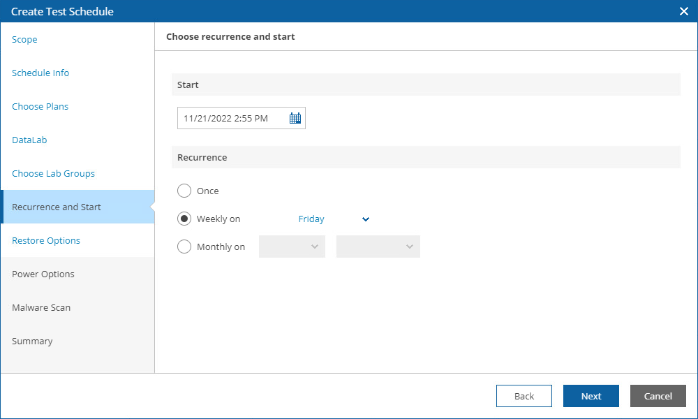 At the Recurrence and Start step of the wizard, define scheduling settings for the lab: