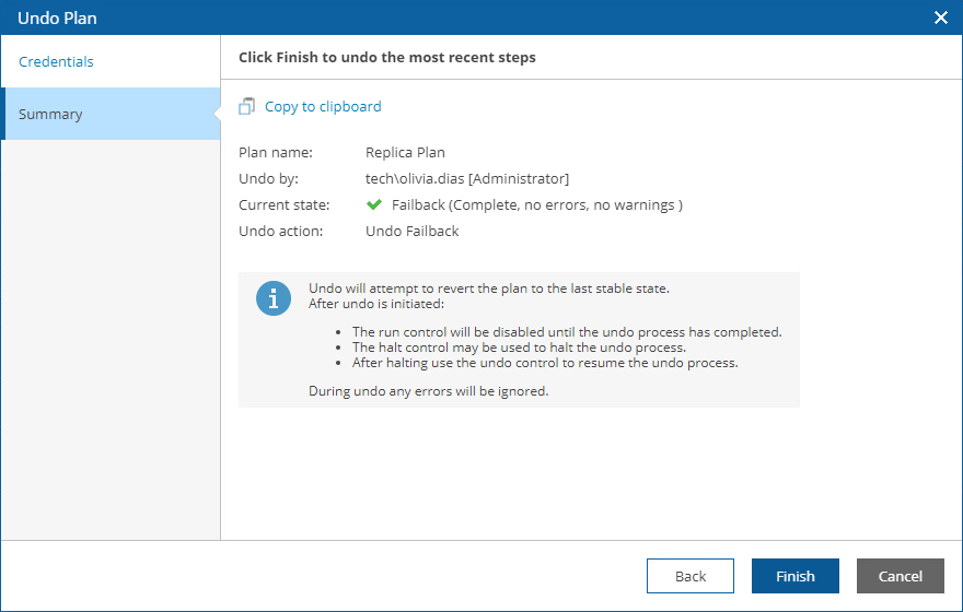 The Undo Failback action powers on VM replicas running on target hosts and switches from the production VMs back to the VM replicas — as a result, the plan acquires the FAILOVER state. For more information on the undo failback operation, see the Veeam Backup & Replication User Guide, section Undo Failback.