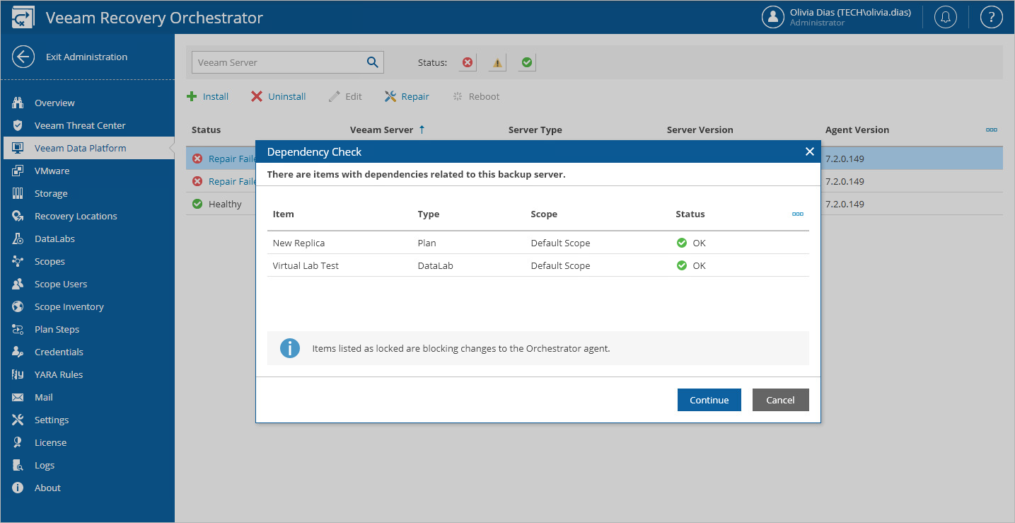 As soon as you uninstall the Orchestrator agent from the Veeam Backup & Replication server, all its related recovery plans will no longer be able to run, and all its related DataLabs will be removed from Orchestrator. All template jobs and credentials collected from the server will also be excluded from Orchestrator components, and the Protect VM Group steps that use any of these jobs will be removed from recovery plans as well. |