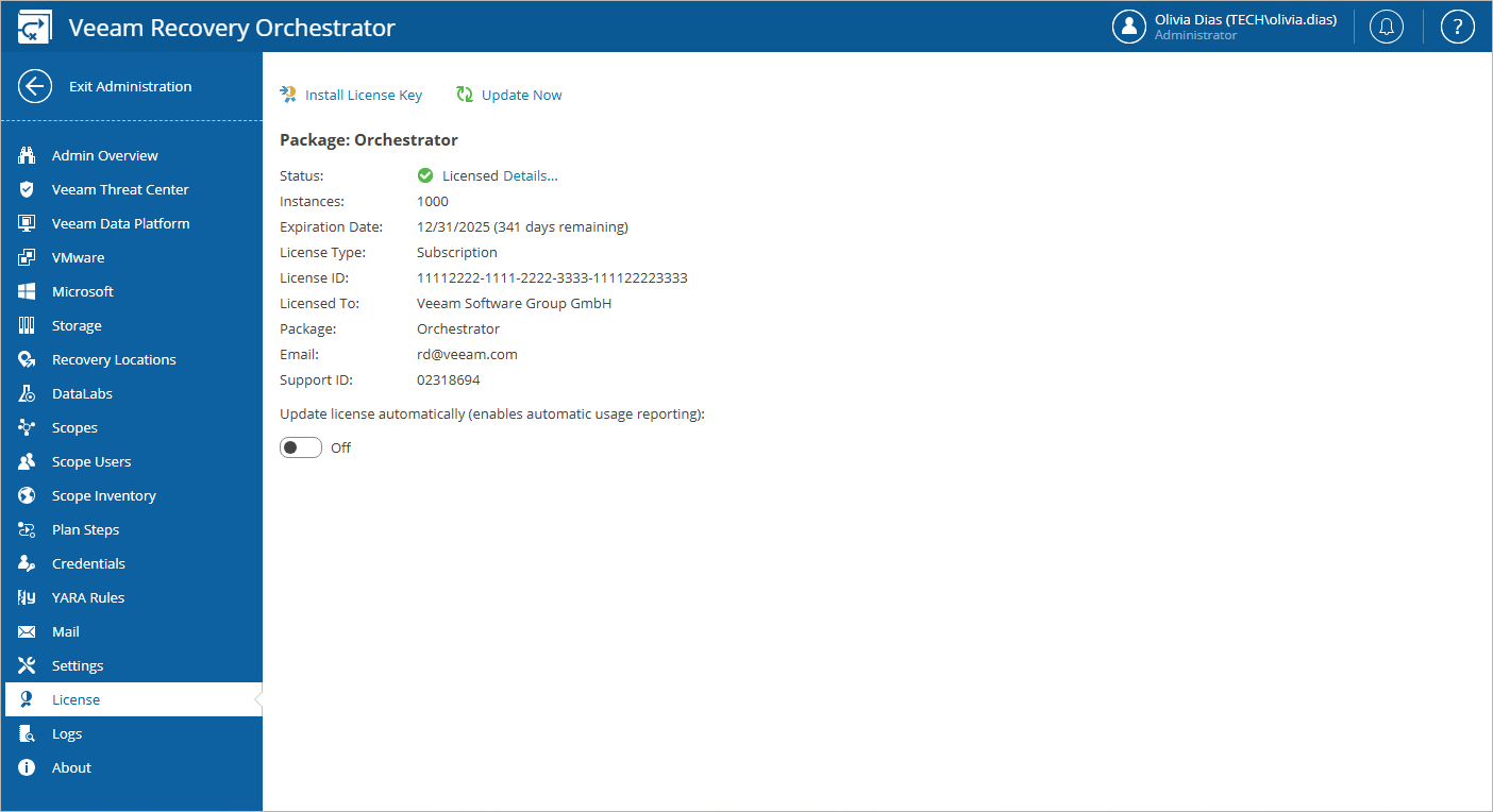 - Support ID — the ID of the contract (required for contacting Veeam Customer Support).