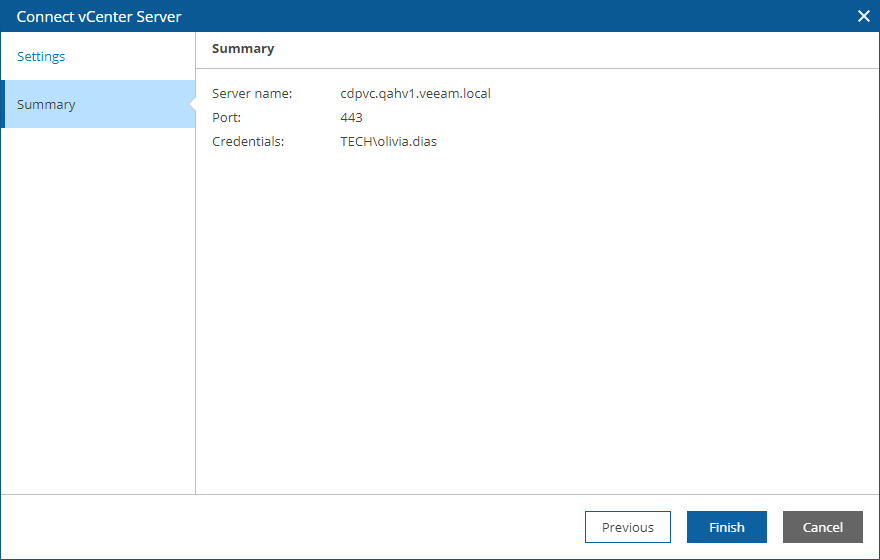 - At the Summary step of the wizard, review the connection details and click Finish.