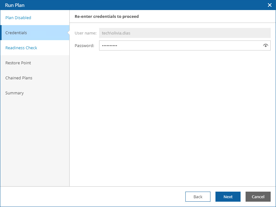 The Run action causes VMs in a plan to fail over to their replicas. For more information on the replica failover process, see the Veeam Backup & Replication User Guide, section Replica Failover.