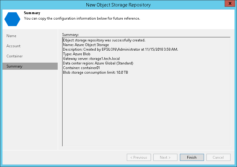 第 4 步。使用向导完成操作 At the Summary step of the wizard, complete the object storage repository configuration:Review details of the object storage repository.Click Finish to exit the wizard.