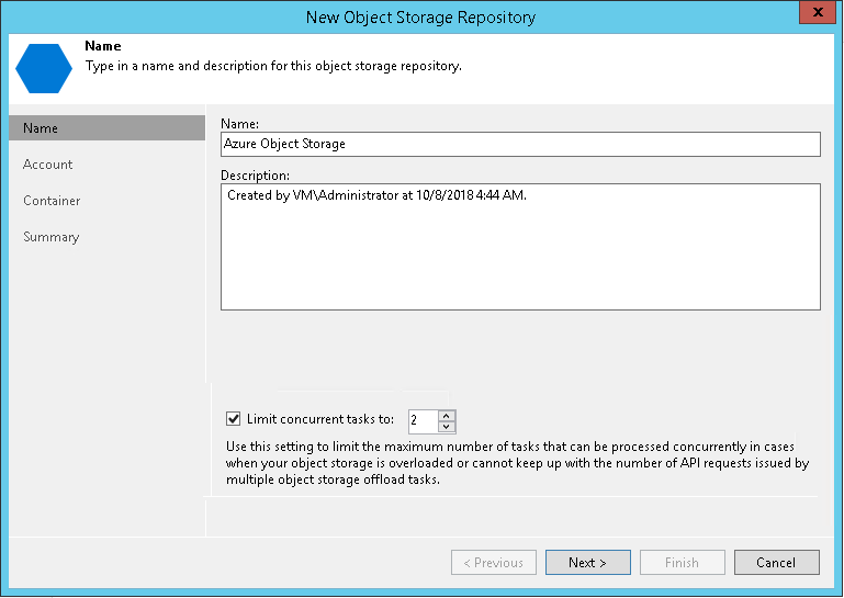 At the Name step of the wizard, specify a name and description for the object storage repository: