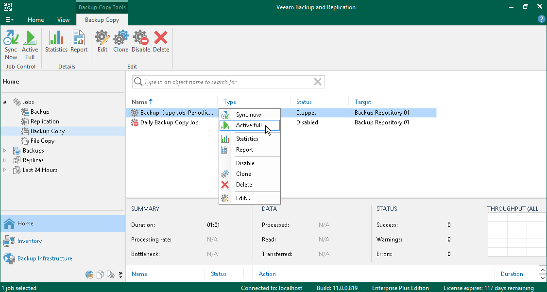 - In the working area, select the backup copy job and click Active full on the ribbon or right-click the backup copy job and select Active full. Veeam Backup & Replication will start a new backup copy session, copy data from the source backup repository and save it in a full backup file in the target backup repository.
