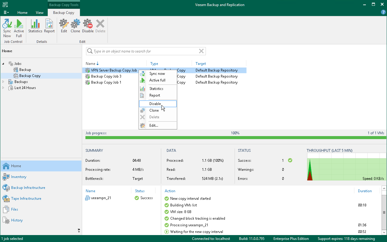 You can temporary disable backup copy jobs. The disabled job is paused for some period of time and is not run by the specified schedule. You can enable a disabled job at any time. You can also permanently delete a job from Veeam Backup & Replication and from the configuration database.