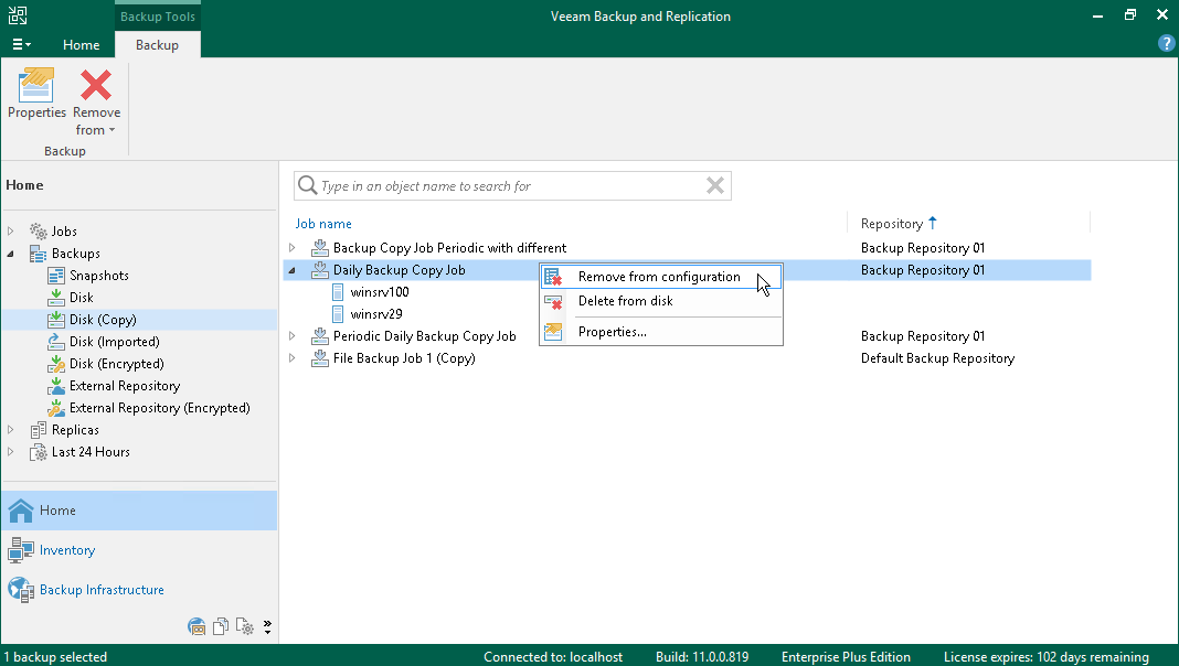 - In the working area, right-click the backup copy and select Remove from configuration.