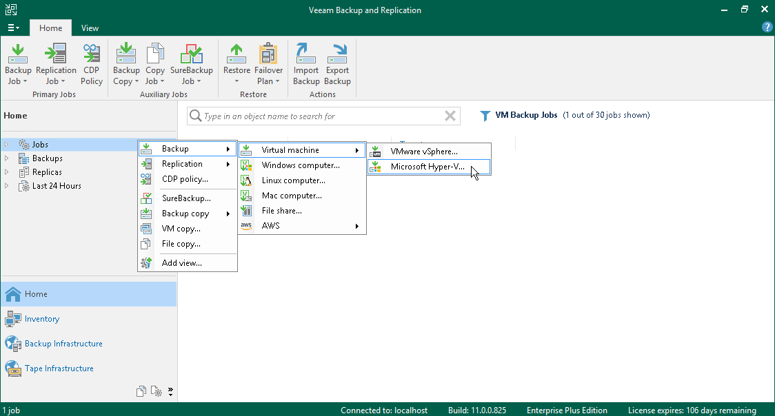 - On the Home tab, click Backup Job > Virtual machine > Microsoft Hyper-V.