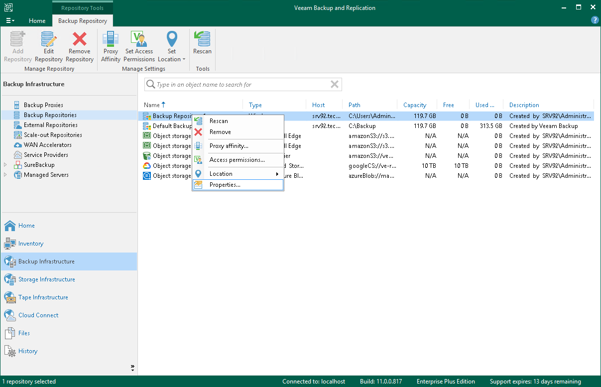 - 在工作区中,选择备份存储库并点击功能区上的 Edit Repository(编辑存储库),或右键单击备份存储库并选择 Properties(属性)。
