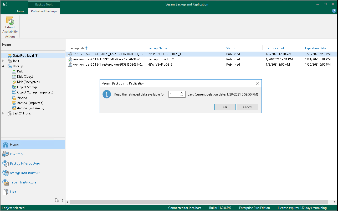- Open the Home view. In the inventory pane select Data Retrieval. In the working area, select the retrieved backup file whose availability period you want to extend, and click Extend Availability on the ribbon. You will be prompted to select the number of days you want to add to the availability expiration time.