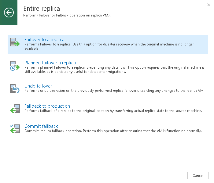- Open the Home view. In the inventory pane select Replicas. In the working area, right-click the necessary replica and select Failover Now.