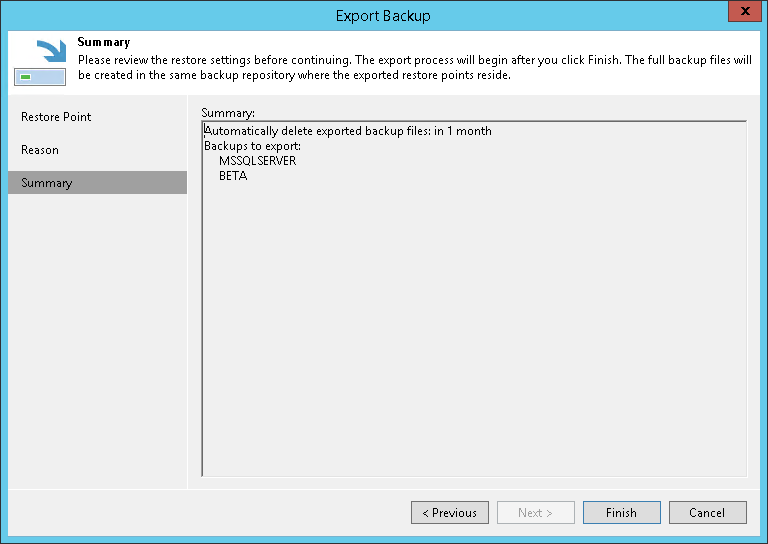 第 4 步。使用向导完成操作 At the Summary step of the wizard, review summary information, click Finish and wait until the restore session, which is described in Viewing Session Statistics, is complete.