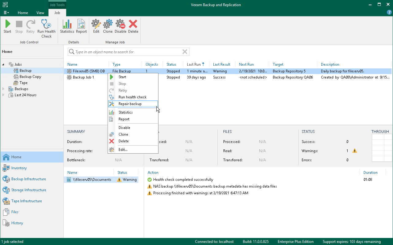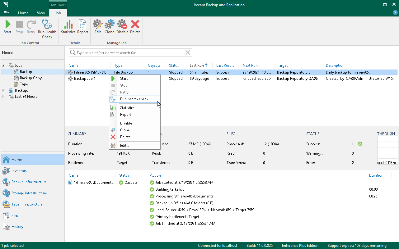- In the working area, select a job of the File Backup type and click Run Health Check on the ribbon or right-click the job and select Run health check.