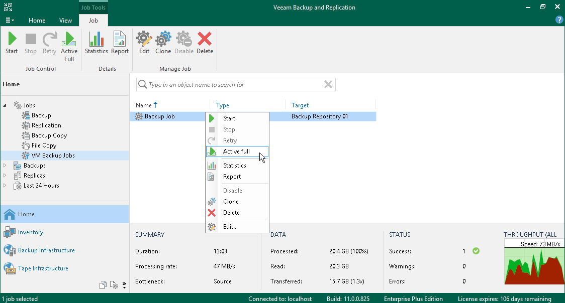 - In the working area, select the job and click Active Full on the ribbon or right-click the job and select Active Full.