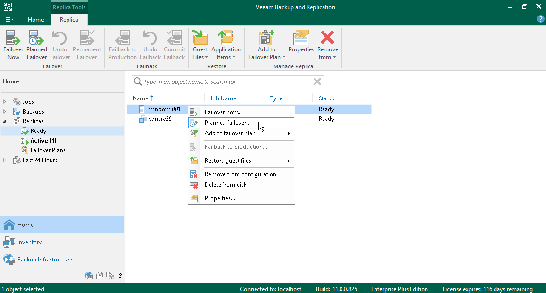 - Open the Home view, expand the Replicas node. In the working area, select one or more VMs and click Planned Failover on the ribbon. You can also right-click one of the selected VMs and click Planned Failover.