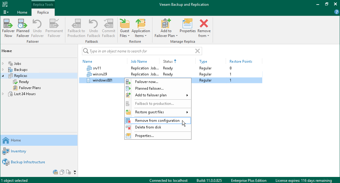 如需从 Veeam Backup & Replication 控制台和配置数据库中删除复制副本记录,则可使用 Remove from configuration(从配置中删除)操作。